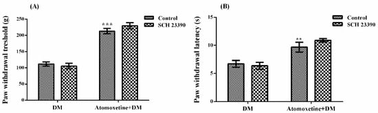 Effects of SCH 23390 pre-treatments on the antihyperalgesic responses induced by atomoxetine (3 mg/kg, 14 days) against mechanical (A) and thermal (B) nociceptive stimuli applied in the Randall-Selitto and Hargreaves tests, respectively. Values are given as mean ± S.E.M. Significant difference against physiological saline administrated diabetic group (DM) is ** p < 0.01; *** p < 0.001. Two-way repeated ANOVA, post hoc Bonferroni test, n = 8.