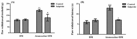 Effects of sulpiride pre-treatments on the antihyperalgesic responses induced by atomoxetine (3 mg/kg, 14 days) against mechanical (A) and thermal (B) nociceptive stimuli applied in the Randall-Selitto and Hargreaves tests, respectively. Values are given as mean ± S.E.M. Significant difference against physiological saline administrated diabetic group (DM) is ** p < 0.01; *** p < 0.001; Significant difference against atomoxetine administrated diabetic groups (Atomoxetine+DM) are a p < 0.05 and c p < 0.001. Two-way repeated ANOVA, post hoc Bonferroni test, n = 8.