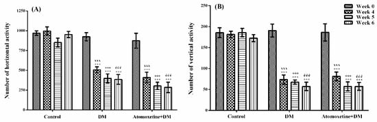 The results of the Bonferroni tests revealed that the number of horizontal and vertical locomotor activities measured at 4th week in all of the diabetic groups were significantly lower than those of measured before the induction of diabetes (Week 0) (p < 0.001). On the other hand, atomoxetine treatment did not induce a further change in the locomotor activities (Figure 8).