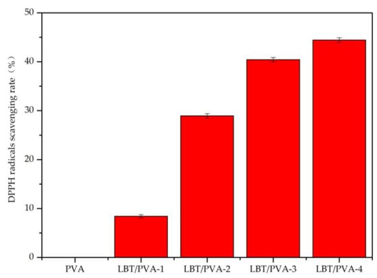 Because of its polyphenols content, LBT presented high 1,1-diphenyl-2-picrylhydrazyl (DPPH) radical scavenging ability in solution (Figure 1). In the composite LBT/PVA membrane, LBT endowed the membrane with good DPPH radical scavenging ability. When the membrane came into contact with moisture, water molecules entered it, causing the swelling of the film. As a result, some LBT molecules were released from the composite membranes. Over time, the network structure of the membrane loosened and the maintenance energy decreased, resulting in a dramatic increase in the release of LBT, which enhanced DPPH free radical scavenging [9]. As shown in Figure 2, the scavenging rate of DPPH free radicals increased significantly with the increase of the tannin content in the LBT/PVA composite membrane. When the tannin content increased from 0.25 to 2.00%, the scavenging rate of DPPH radicals increased from 8.43 to 44.44%.