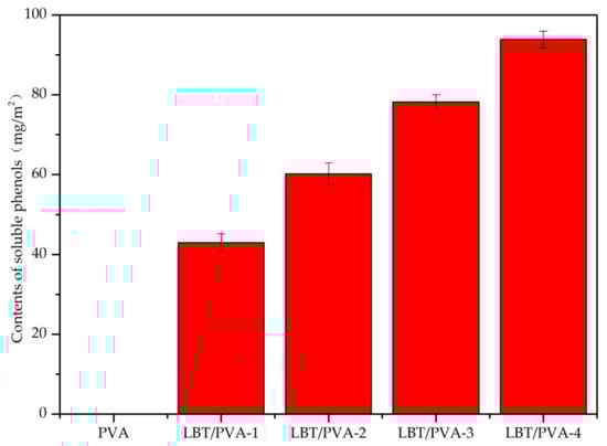 In order to evaluate the effects of different concentrations of LBT in the membrane, soluble phenols in the membranes were determined, and the result is illustrated in Figure 3. With the increase of LBT concentration in the membranes, the content of soluble phenols increased. This resulted in improved DPPH radical scavenging, antioxidation in the acidic starch–potassium iodide (KI) discoloration reaction, and UV protection. However, the increase in soluble phenol content was not proportional to the LBT content. The reason for this was that membranes with different LBT contents were incubated for the same limited time (30 min), and the release profiles of soluble phenols were similar in this short time frame. Additionally, the release rate was influenced by other factors besides the initial LBT content, such as diffusion area and diffusion distance.