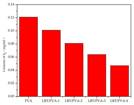 With the increase of LBT content in the composite membranes, the membranes became increasingly resistant to oxidation. The presence of LBT inhibited I− oxidation to I2, thereby reducing the amount of I2 generated. According to Figure 4, the amount of I2 produced with the blank PVA sample was the highest, corresponding to about 0.12 mg/mL. With increasing amounts of LBT in the composite membrane, the content of I2 gradually decreased, reaching a minimum (about 0.05 mg/mL) in the LBT/PVA-4 membrane. This implies that the higher the LBT content in the composite membrane, the stronger the antioxidant capacity of the membrane.
