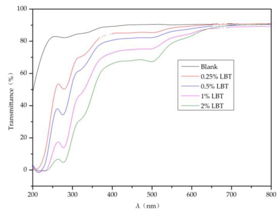 The data presented in Figure 5 indicate that with increasing tannin content in the composite membrane, the transmittance of UV light considerably decreased, meaning that UV absorption by the membrane increased accordingly [10]. As the tannin content increased from 0 to 2.00%, the transmittance of UV light (wavelength less than 280 nm) decreased from 80% to less than 10%, while the transmittance of near-infrared (650 to 800 nm) light did not decrease. The transmittance of visible (400–500 nm) light also decreased from 90 to ~65%. This indicates that the composite membrane is suitable for UV-protective packaging materials.