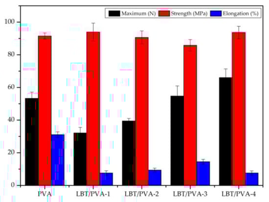 The results shown in Figure 6 reveal that the average maximum force of the blank membrane was 53.32 N. After the addition of 0.25% LBT, the average maximum force of the membrane decreased to 32.12 N. PVA molecules are linear polymers, which could easily organize into aggregates. When a small amount of LBT was added to the PVA matrix, the well-organized aggregate structure of PVA was altered, resulting in a decrease in its strength. However, with the increase of LBT content, the maximum force of the membrane increased because of the good compatibility of LBT with PVA. For example, with the addition of 2.00% LBT, the average maximum force reached 66.03 N. Compared to the maximum force, the tensile strength of the membranes did not change much with the increase of LBT content. The tensile strength was about 90 MPa for all membrane samples. Regarding elongation, the value for the blank membrane was 31.1% and decreased considerably with the addition of 0.25–2.00% LBT. The reason for this could be that the tannin molecules cross-linked, thus limiting the rotation and movement of the PVA molecular chains, which resulted in the elongation decrease [11].