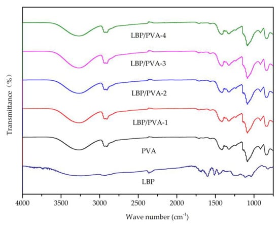 The FT–IR spectra of the PVA, LBT, and LBT/PVA composite membranes with different LBT contents are displayed in Figure 7. The broad peak at about 3300 cm−1 was attributed to the hydroxyl group (–OH). The small peak at about 2900 cm−1 was attributed to the stretching vibration of C–H. The peak at about 1100cm−1 was ascribed to the stretching vibration of the ether bond (C–O). Because of the very low amount of LBT in the composite membranes (the maximum amount was only 2.00%), the FT–IR spectra of the composite membranes did not show any obvious peaks corresponding to LBT [12].