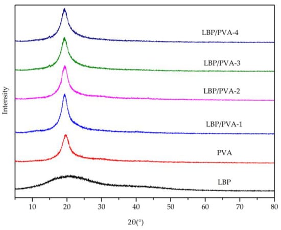 X-ray diffraction (XRD) patterns of the LBT, PVA, and LBT/PVA composite membranes.