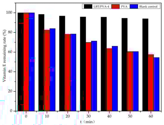 Vitamin E is a common nutrient in food that oxidizes easily and deteriorates under the irradiation of ultraviolet light [25]. Using an LBT/PVA composite membrane as a food packaging material could protect vitamin E, since the LBT/PVA composite membranes demonstrated excellent UV protection ability. In this paper, a quartz cuvette containing 40 ppm vitamin E n-hexane solution was coated with one of the membranes, and then the solution was irradiated with a 3 W ultraviolet lamp at 254 nm. A non-coated sample served as the blank control. The absorbance of the vitamin E solution was measured at 300 nm, with 10 min irradiation intervals, and the remaining vitamin E was calculated on the basis of the prepared standard curve.