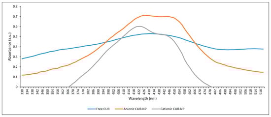 During the light absorption study, the absorbance signals of free CUR, and anionic and cationic CUR-NP were similar in the blue range of the UV-visible spectrum. The free CUR presented maximum absorbance at 430 nm and both anionic and cationic CUR-NP at 426 nm and 424 nm, respectively (Figure 2). Although the wavelength values were close, the absorbance of the free CUR formulation was lower than those of the CUR-NPs, with values of 0.53, 0.712, and 0.602 a.u. observed for free CUR, and anionic and cationic CUR-NP, respectively.