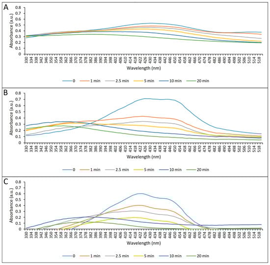 Photodegradation of free CUR, and anionic and cationic CUR-NPs after different periods of illumination with blue LED. (A) Free CUR; (B) anionic CUR-NP; (C) cationic CUR-NP.