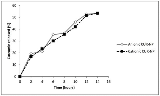 In the present study, the percentage of EE was observed to be 60.84% for anionic CUR-NP and 73.81% for cationic CUR-NP. These values agree with other investigations that verified EE from 46.9% to 97% [33,37,40,41,42,43]. The release of CUR from NP was slow and progressive. After 12 h, approximately 52% of CUR was released from the NP. The authors’ previous study verified that 48 h was needed to release 96% of CUR from NP [31], and other investigations also observed a progressive release of CUR from 20% to 92.8% during periods from 6 h to 15 days [28,33,37,44,45].