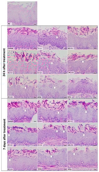 Light micrographs showing sections of tongue mucosa submitted to the periodic acid-Schiff (PAS) histochemical method. The light micrographs show the epithelium tongue of healthy, infected, and treated animals, euthanized 24 h and seven days after treatment. NC group: healthy and untreated animals; Control group: infected animals that did not receive any treatment (C − L−); C + L+, AC + L+, and CC + L+ groups corresponded to the animals treated with aPDT mediated by free CUR, anionic and cationic CUR-NP, respectively, and blue LED light; C + L−, AC + L−, and CC + L− groups corresponded to evaluation of each PS alone (free CUR, and anionic and cationic CUR-NP, respectively); NYS1 and NYS4 groups: animals treated with Nystatin 100,000 IU once (under anesthesia) and four times daily, respectively. Arrows: invasion of C. albicans in the subjacent epithelium. Magnification: ×40. Scale bar: 20 μm.