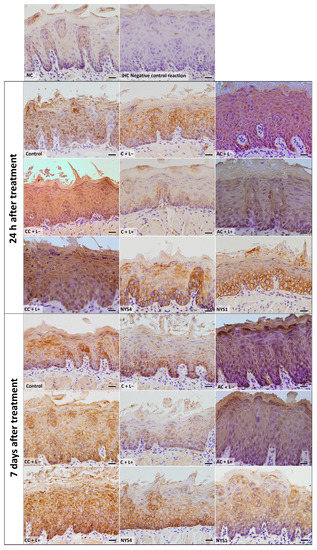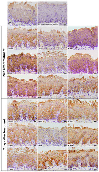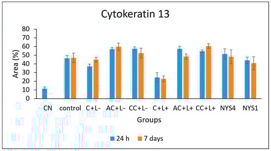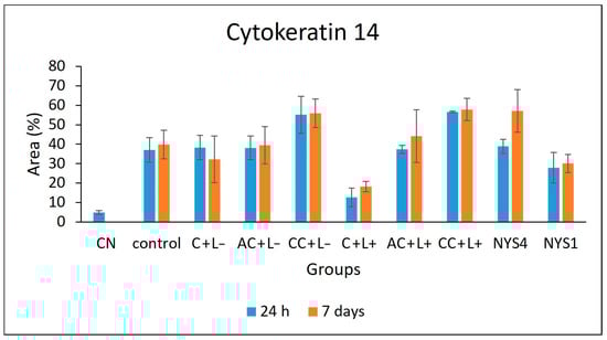 The evaluation of CK13 and CK14 by immunohistochemistry (IHC) (Figure 7 and Figure 8) demonstrated different patterns in the immunolabelling according to the groups of treatments and periods. However, inferential statistics were not performed because only two animals from each group were evaluated (three sections for each animal). In healthy animals (NC), the lowest CK13 and CK14 immunolabelling was observed (only 5% and 11% of the epithelial area, respectively, was immunolabelled). Conversely, the non-treated infected mice (control group, C − L−) showed a more intense immuno-expression of both CKs at 24 h and seven days after treatment (46–47% for CK13, and 37–39% for CK14). Compared with the control group, a less intense immuno-expression for CK13 was observed in the animals treated with free CUR (C + L−) assessed after 24 h (37%) and NYS1 for both periods (40–44%), and the lowest immuno-expression among the infected animals was observed in the aPDT group with free CUR (C + L+) for both periods evaluated (22–24%, Figure 9). The highest CK13 immunolabelling was observed in groups treated with both CUR-NP (without and with light: AC + L−, CC + L−, AC + L+, CC + L+) and NYS4 (48–60%). A similar finding was observed for CK14 (Figure 10), as infected animals submitted to aPDT with free CUR showed the lowest immuno-expression (12–18%), followed by NYS1 (27–30%). The highest immunolabelling was verified in mice treated with cationic CUR-NP (without and with light, CC + L− and CC + L+, respectively) at both periods, and NYS4 after seven days (55–57%), while animals treated with anionic CUR-NP without and with light (AC + L− and AC + L+, respectively) for both periods and NYS4 evaluated after 24 h showed values (37–44%) similar to the control group.