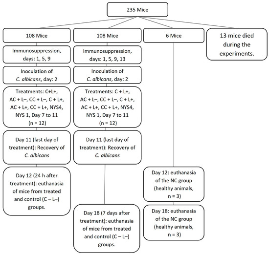 Treatments were performed daily from days 7 to 11. The groups PS only and aPDT involved free CUR (C + L− and C + L+, respectively), anionic CUR-NPs (AC + L− and AC + L+, respectively), and cationic CUR-NP (CC + L− and CC + L+, respectively). Each experiment was performed with 16–20 mice divided into four different groups (control, PS only, aPDT, and nystatin). Animals were allocated to the following groups: for aPDT, animals were anesthetized with an intraperitoneal injection of ketamine hydrochloride (100 mg/kg of body weight) associated with xylazine hydrochloride (10 mg/kg of body weight). Then, 50 μL of the PS at 260 μM was pipetted on the dorsum of the tongue. Following 20 min in the dark (pre-irradiation time), the tongue of the animals was illuminated for 7 min at 37.5 J/cm2 (C + L+, AC + L+, and CC + L+ groups). To verify a possible toxic effect of the applied PS, additional animals were treated only with the PS during the pre-irradiation and illumination times (C + L−, AC + L+, and CC + L+ groups). The control group (C − L−) received only sterile phosphate-buffered saline (PBS) during the same pre-irradiation and illumination times. The effect of light alone was not evaluated, as previous studies demonstrated no fungicidal effect of blue light at 37.5 J/cm2 [19,72]. To compare, two additional groups received topical application of nystatin 100,000 IU. Regarding the NYS1 group, nystatin was applied once a day for five consecutive days under anesthesia. To simulate the clinical use of nystatin, another group received nystatin for four times a day (intervals of four hours) during five consecutive days without anesthesia (NYS4). Moreover, in the NC group, animals were not inoculated with the fungi and did not receive any treatment. Twelve animals from each group were evaluated in each period of euthanasia [20], which was performed 24 h and 7 days after the last day of treatment for each group, with the exception of the NC group (n = 3).