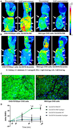 After the CA synthesis (Figure 1), the in vivo imaging properties of Gd-DOTA-P88 were first evaluated in a mouse model bearing both wild type CHO cells and CHO-FXYD2γa+-cells. The CA showed clear FXYD2γa+-specific contrast enhancement over both the control peptide and the wild type cells (Figure 2A,B,D and Figure S1). The FXYD2γa expression was confirmed by immunofluorescence and qPCR (Figure 2C; Figure S2).