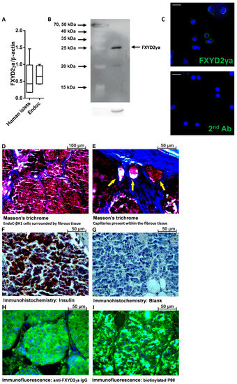 Expression of FXYD2γa in pancreatic human islets and EndoC-βH1 cells. (A) Quantitative RT-PCR (qPCR) of FXYD2γa mRNA expression in EndoC-βH1 cells (n = 5) and human pancreatic islets (n = 4). Data are presented as a box-plot. (B) A representative immunoblot of EndoC-βH1 cells, with alpha-tubulin as a reference protein (n = 3); (C) Immunocytochemistry of EndoC-βH1 cells showing surface localization of FXYD2γa (green) and Hoechst staining of nuclei (blue) (n = 3). The negative staining control of EndoC-βH1 cells (without the FXYD2γa antibody) is presented at the right side of panel C; the white scale bar represents 1 µm. The luminosity and the contrast were uniformly increased in both pictures to improve visualization. The original pictures are shown in Figure S5 (D–I). Histological evaluation of the implanted EndoC-βH1 tumors, showing cells clustered into pseudo-islets surrounded by fibrotic tissue (D), capillary networks (yellow arrows) (E), insulin expression (F) with its corresponding negative control (G) and FXYD2γa detected with either SPY393 polyclonal antibody (H) or the biotinylated P88 (I); (D–I) are representative micrographs from 2 EndoC-βH1 cell-implanted mice.