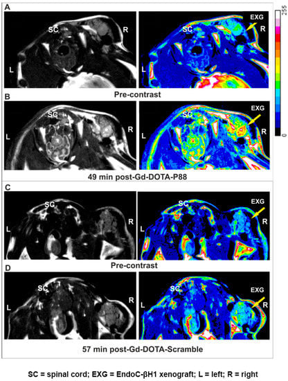 Non-invasive MRI of EndoC-βH1 xenograft bearing-mice using Gd-DOTA-P88 and Gd-DOTA-Scramble. (A–D) Representative MR images of mice bearing EndoC-βH1 transplants. Pre-contrast images (A,C) were acquired before injection of CAs and the post-contrast images were obtained 50 min (B,D) after i.v. administration of 0.1 mmoL Gd/kg b.w. of Gd-DOTA-P88 (B) or Gd-DOTA-Scramble (D). Mice were implanted with EndoC-βH1 grafts in transplantation rings in the right hind leg and vehicle transplantation rings in the left hind leg. The images are displayed in grey-scale (left row) and in pseudo-coloring overlay (right row). The images are representative of 4–6 similar experiments. Legend: SC = spinal cord; EXG = EndoC-βH1 xenograft; L = left; R = right.