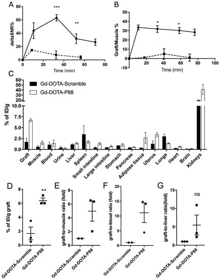 The contrast enhancement of EndoC-βH1 xenografts and the biodistribution profile of Gd-DOTA-P88 and control CA in mice implanted with EndoC-βH1 cells. (A,B) Quantification of the acquired images within regions-of-interest (ROIs) drawn around each xenograft and expressed as ΔSNR% (A) or X/M % (B). Data are expressed as ROI ± SD of 4–6 experiments; unpaired Student’s t-test; * p ≤ 0.05; ** p ≤ 0.01; *** p ≤ 0.001. (C–G) The biodistribution analysis of Gd-DOTA-P88 and control CA Gd-DOTA-Scramble was performed in mice xenografted with human EndoC-βH1 (n = 3) (C). The evaluation was done at 90 min after i.v. administration of 0.1 mmoL Gd/kg b.w. of Gd-DOTA-P88 (white bars) or control CA Gd-DOTA-Scramble (black bars) and expressed as percentage of the injected dose per gram of dried tissue (% of ID/g) ± SEM; (D–G)). Individual uptake levels of the CAs in EndoC-βH1 grafts (D, n = 3) and the selected background tissues, where the results are expressed as graft-to-muscle (E, n = 2), graft-to-blood (F, n = 2) and graft-to-liver (G, n = 3) ratios of individual mice. Data are presented as mean ± SEM; unpaired Student’s t-test, * p ≤ 0.05.