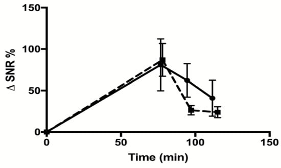 The biodistribution analysis (Figure 5C) showed that the Gd-DOTA-P88 accumulated significantly in the EndoC-βH1 xenografts as compared to the Gd-DOTA-Scramble (p < 0.05) (Figure 5D). Both CAs showed high uptake in the kidneys, with a fast elimination of unbound CA from blood (i.e., 1.4% of ID/g for Gd-DOTA-P88; 1.6% of ID/g for Gd-DOTA-Scramble) and non-targeted tissues at 75–80 min after administration; this is the usual pattern of renal excretion of paramagnetic CAs. The ratios for Gd-DOTA-P88 accumulation in EndoC-βH1 xenografts as compared to key background tissues were as follows: xenograft-to-muscle, xenograft-to-blood and xenograft-to-liver ratios respectively of 4.3 ± 2.4, 4.6 ± 3.4 and 4.9 ± 0.8, with a significant higher xenograft-to-liver ratio in comparison to the Gd-DOTA-Scramble (p < 0.05) (Figure 5E–G). In order to exclude an artificial accumulation of Gd-DOTA-P88 due to a reduced renal clearance, we compared the ΔSNR% measured in kidneys for both probes. The clearance kinetics were similar for the two CAs (Figure 6).