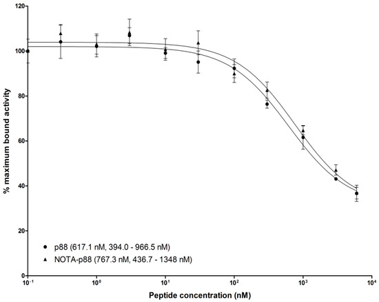 To determine the binding affinity of P88, we performed an in vitro competitive binding assay. For this purpose, NOTA-P88 was labeled with a specific activity of 15 MBq/nmol, reaching a radiochemical purity of ~90%. The IC50 value for NOTA-P88 was 767.3 nM, which did not differ significantly from the IC50 value of unconjugated P88 (617.1 nM) (Figure 7).