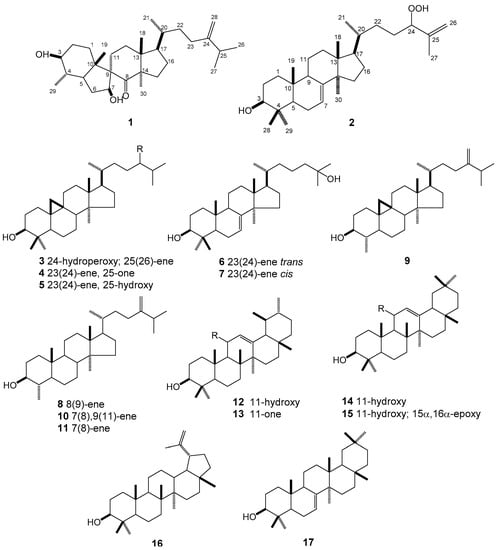 - Xia, Q.; Zhang, H.; Sun, X.; Zhao, H.; Wu, L.; Zhu, D.; Yang, G.; Shao, Y.; Zhang, X.; Mao, X.; et al. A comprehensive review of the structure elucidation and biological activity of triterpenoids from Ganoderma spp. Molecules 2014, 19, 17478–17535. [Google Scholar] [CrossRef] [PubMed]