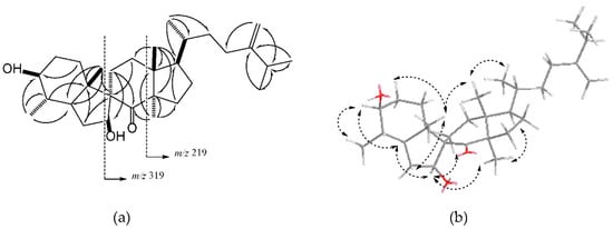 Compound 1 was isolated as a white solid. Its HREIMS spectrum showed a molecular ion peak at m/z 458.3759 [M+], corresponding to the molecular formula C30H50O3. The 1H-NMR (Table 2, Figure S1) displayed characteristic signals for seven methyl groups [δH 0.66 (3H, s), 0.93 (3H, d, J = 6.5 Hz), 0.95 (3H, d, J = 6.2 Hz), 1.02 (3H, d, J = 6.7 Hz), 1.03 (3H, d, J = 6.8 Hz), 1.21 (3H, s), 1.48 (3H, s)], two oxygenated methine protons [δH 3.05 (1H, td, J = 10.0, 4.8 Hz) and 4.35 (1H, m)], and two olefinic protons [δH 4.66 (1H, d, J =1.2 Hz) and 4.72 (1H, d, J = 0.9 Hz)]. The 13C-NMR (Table 2, Figure S2) and HMQC spectra (Figure S3) disclosed the existence of thirty carbons including a ketone (δC 215.1), two olefins (δC 156.5 and 106.2), and two oxygenated methines (δC 80.5 and 77.5). The aforementioned data suggested that 1 was a triterpenoid (Figure 2). In the 1H-1H COSY spectrum (Figure S5), five fragments were obtained according to the spin systems of H2-1/H2-2/H-3/H-4/H-5/H2-6/H-7, H2-11/H2-12, H2-15/H2-16/H-17, H3-21/H-20/H2-22/H2-23, and H-25/ H3-26/ H3-27. The HMBC correlations (Figure S4) from H-4 and H3-29 to C-3, and from H2-6 and H2-11 to C-7 indicated that the two hydroxyl groups were located at C-3 and C-7, respectively. Furthermore, the HMBC correlations from both H3-19 and H2-6 to C-5, C-9, C-10, and from H-7 to C-5, C-9 and C-10, as well as the 1H-1H COSY cross-peaks of H2-6/H-7 and H2-11/H2-12 suggested that the quaternary carbon C-9 was the connectivity of a spiro center. The ketone group was substituted at C-8, which was indicated by the HMBC correlations from H3-30 to C-8, C-13, and C-14, and from H2-11 to C-8. The EIMS of 1 displayed two characteristic peaks of spiro-triterpenoid at 319.2 [C21H35O2] and 219.2 [C16H27], together with m/z 440 [M − H2O]+ and 422 [M − 2H2O]+. The relative configuration of 1 was determined by NOESY spectrum (Figure 2, Figure S6). The NOESY correlations between H3-19 and H-2β, H-6β, and H3-18 indicated that these protons were at the same orientation. Furthermore, the orientations of the two hydroxyl groups were deduced as β on the basis of the NOE correlations between H-7 and H-5α, H-11α, and H3-30, and between H-3 and H-5α, and H3-29. The above NOE correlations also suggested that C-9 was R configuration. The C-ring was supposed to be a boat configuration based on the NOE correlations of H-5α with H-11β and H-17α with H3-30, which was the same as that of spiroinonotsuoxodiol. Based on the comparison of its NMR data with that of a spiro-triterpene in the literature [32], the structure of 1 was determined to be (3S,4S,7S,9R)-4-methyl-3,7-dihydroxy-7(8→9) abeo-lanost-24(28)-en-8-one (Figure 1).