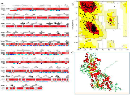 The bioinformatics analysis of transketolase. (A) Structure alignment between AtTKL1 in A. thaliana and ZmTKL1 in Zea mays; (B) Ramachandran Plot of the protein after structural refinement; (C) Refined structure of the AtTKL1 protein, where helix is shown in red, yellow indicates beta sheets, and coil is shown in green color.