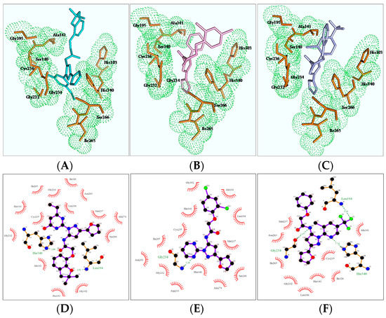 Binding mode of ZINC12007063 (A,D), 4u (B,E) and 8h (C,F).
