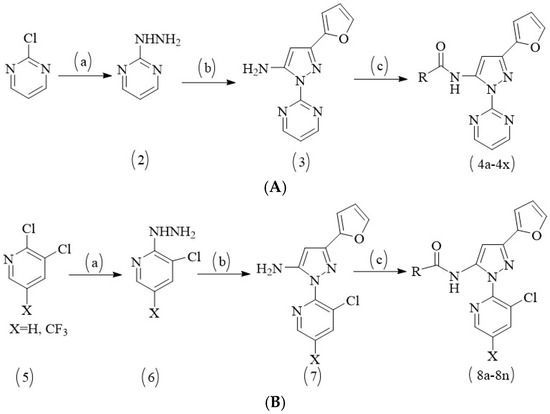 Synthetic route for compounds 4a–4x and 8a–8n. (A) Reagents and conditions for 4a–4x: (a) absolute ethanol, hydrazine hydrate, refluxing for 90 min; (b) absolute ethanol, 2-furoylacetonitrile, refluxing for 120 min; (c) anhydrous DCM, substituted acyl chloride, Et3N, room temperature, overnight. (B) Reagents and conditions for 8a–8n: (a) absolute ethanol, hydrazine hydrate, refluxing for 180 min; (b) absolute ethanol, 2-furoylacetonitrile, refluxing for 180 min; (c) anhydrous DCM, substituted acyl chloride, Et3N, room temperature, overnight.