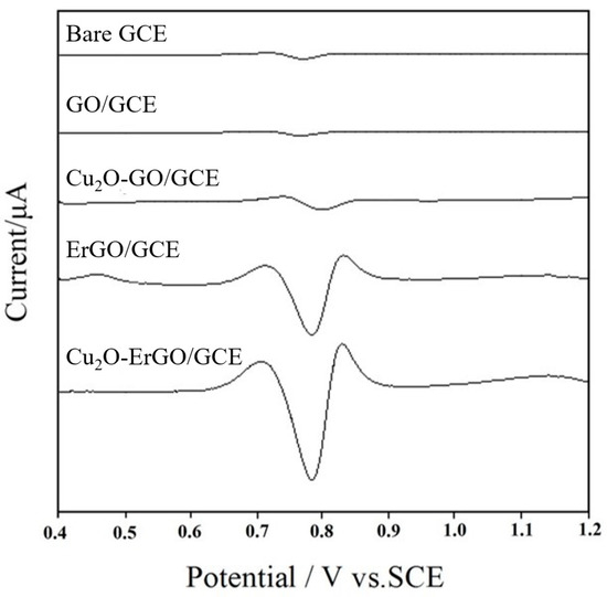 Second-derivative linear sweep voltammetric responses of 1.0 × 10−5 mol/L sunset yellow on different electrodes are presented in Figure 2. On the bare GCE, a weak anodic peak of sunset yellow appears at 798 mV with the anodic peak current (ipa) of 0.725 μA. On the GO/GCE, the oxidation peak current of sunset yellow decreases to 0.497 μA, which is mainly due to the present of the poor electrical conductivity of GO. On the Cu2O-GO/GCE, an apparent anodic peak of occurred at 770 mV, and the ipa increases to 0.925 μA, probably owing to the electrocatalytic activity of Cu2O nanoparticles. When the GO was electrochemically reduced to ErGO, the anodic peak appears at 792 mV and the ipa increases to 16.93 μA. This phenomenon may be related to the high electrical conductivity, large specific surface area, and rapid heterogeneous electron transfer rate of ErGO. Moreover, the adsorption capacity of sunset yellow on the electrode surface is improved greatly by the π-π interaction, because the conductive carbon-conjugated networks are restored after the reduction process. When the GCE was modified with Cu2O-ErGO nanocomposites, the ipa is the largest (18.08 μA), which is about 25 fold greater than that of bare GCE. It mainly due to the synergistic enhancement effect between Cu2O nanoparticles and ErGO sheets, which significantly improves the sensitivity of sunset yellow detection.