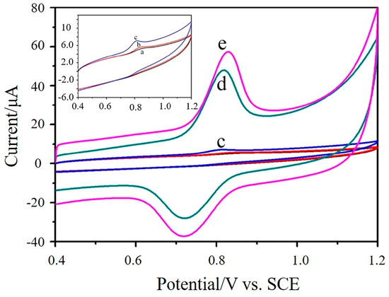 The electrochemical behavior of 1.0 × 10−5 mol/L sunset yellow on the GCE (a), GO/GCE (b), Cu2O-GO/GCE (c), ErGO/GCE (d), and Cu2O-ErGO/GCE (e) were further investigated by cyclic voltammetry (Figure 3). All of the electrodes appear a pair of redox peaks, meaning that sunset yellow undergoes a quasi-reversible process. Obviously, a pair of sharp redox peaks occurs on the ErGO/GCE and Cu2O-ErGO/GCE. Furthermore, the order of anodic peak currents obtained from cyclic voltammograms is consistent with the second-derivative linear sweep voltammograms, which further confirms that Cu2O-ErGO nanocomposites can significantly enhance the electrochemical response toward sunset yellow.