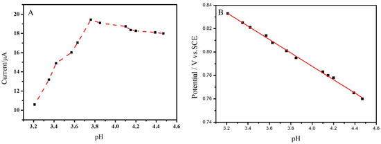 (A) Effects of pH value on the anodic peak currents of 1.0 × 10−5 mol/L sunset yellow on the Cu2O-ErGO/GCE; and, (B) The plot of the anodic peak potential of 1.0 × 10−5 mol/L sunset yellow against pH value.
