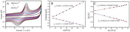 (A) Cyclic voltammograms of 1.0 × 10−5 mol/L sunset yellow on the Cu2O-ErGO/GCE recorded at various sweep rates (30 mV/s–300 mV/s); (B) Linear plots of anodic and cathodic peak currents (ipa and ipc) of sunset yellow against sweep rates (v); and (C) Linear plots of andic and cathodic peak potential (Epa and Epc) of sunset yellow against Napierian Logarithm of sweep rates (lnv). Supporting electrolytes: 0.1 mol/L PBS.