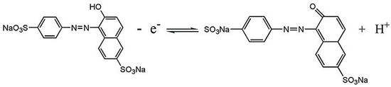 where Epa (V) and Epc (V) represents the anodic peak potential and the cathodic peak potential, respectively; v (V/s) denotes the sweep rate; α is the charge transfer coefficient; ks is the heterogeneous electron transfer rate; n is the electron transferred number; T is Kelvin temperature; F is Faraday constant (96,480 C/mol); and, R is molar gas constant (8.314 J/(mol·K)). Combining the slopes of Equations (1) and (2) with the Epa/Epc vs. lnv equations, the charge transfer coefficient α is estimated to be 0.45 and the electron transferred number n is around 1. Since the equal amount of proton and electron participates in the oxidation process, the electrochemical oxidation of sunset yellow is 1 electron and 1 proton process, which is in accordance with the previous studies [39,41]. Hence, the electrochemical oxidation mechanism of sunset yellow on the Cu2O-ErGO/GCE can be inferred in Figure 6.