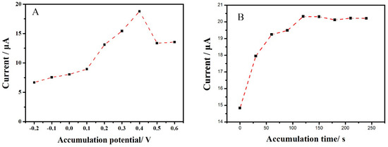 Influences of accumulation potential (A), and accumulation time (B) on the anodic peak currents of 1.0 × 10−5 mol/L sunset yellow on the Cu2O-ErGO/GCE.