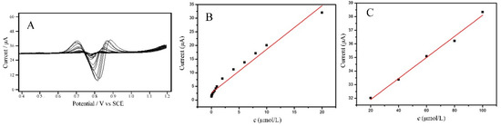 Sweep rate is a crucial parameter that directly affects the electrochemical response of analysts on the modified electrodes. Moreover, it is a powerful tool to reveal the electrochemical reaction mechanism. Cyclic voltammograms at various sweep rates were recorded at 0.1 mol/L PBS solution containing 1 × 10−5 mol/L sunset yellow while using the Cu2O-ErGO/GCE, and their corresponding cyclic voltammograms are shown in the Figure 5A. As expected, with sweep rates increasing, the anodic peaks shift toward positive direction, while the cathodic peaks shift negatively, indicating that the oxidation of sunset yellow on the Cu2O-ErGO/GCE is quasi-reversible. Both the anodic peak currents (ipa) and cathodic peak currents (ipc) increase with the sweep speeding up, however, the background currents also increase. To purist high signal-to-noise (S/N), a suitable sweep rate is recommended as 100 mV/s. It can be clearly seen from Figure 5B that both the anodic peak currents (ipa) and cathodic peak currents (ipc) of sunset yellow is nearly linear with the sweep rates (v). Their linear equations are expressed as: ipa (μA) = 0.2968 v (mV/s) − 4.791 (R2 = 0.998) and ipc (μA) = −0.1471 v (mV/s) + 1.659 (R2 = 0.997), suggesting that the oxidation of sunset yellow on the Cu2O-ErGO/GCE is controlled by the adsorption process [39].