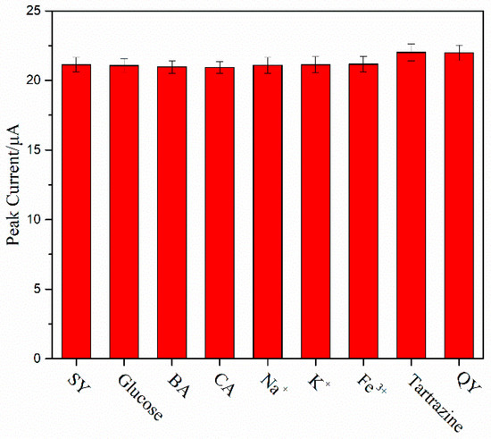 The response peak current of Cu2O-ErGO/GCE for 1 × 10−5 mol/L sunset yellow (SY) in the presence of interfering substances (n = 3). The concentration of glucose, benzoic acid (BA), citric acid (CA), Na+, K+, Fe3+, were 1 × 10−3 mol/L. The concentrations of Tartrazine, quinoline yellow (QY) were 1 × 10−4 mol/L.