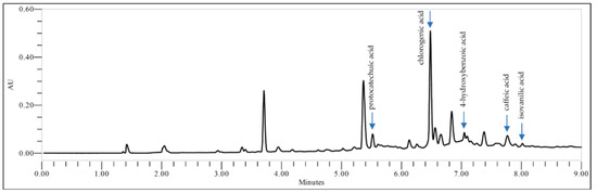 The UPLC analysis of the hydroalcoholic GP extracts demonstrated the presence of protocatechuic, chlorogenic, 4-hydroxybenzoic, caffeic, and isovanilic acids (Figure 1). The highest content was determined for chlorogenic acid (2.00 ± 0.01 mg/g of the dry herb). The other phenolic acids occurred in the lower amounts (µg/g of the dry herb): protocatechuic acid (200.32 ± 4.3), 4-hydroxybenzoic acid (100.43 ± 0.2), caffeic acid (120.54 ± 2.8), and isovanilic acid (60.38 ± 1.6).