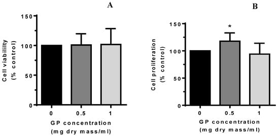 The viability of cells treated with GP (0.125–1 mg/mL) was determined using the Trypan blue exclusion test. Cells were suspended in Hanks′ Balanced Salt Solution and mixed 1:1 (v/v) with 0.4% Trypan blue solution. After 10 min, the number of blue-stained non-viable cells was counted in a hemocytometer.