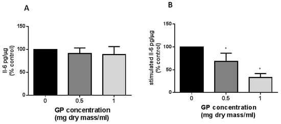Figure 3. Effect of G. parviflora extract (GP) on IL-6 release by endothelial cells. Cells were treated with a GP extract in the absence (A) or presence (B) of Il-1β (1 ng/mL) for 24 h. The data were derived from four independent experiments and are expressed as a parentage of control (mean ± SD). The IL-6 release was detected as pg/µg cell protein. Asterisks represent a significant difference when compared to control cells (* p < 0.5).