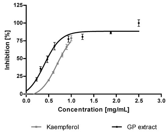 The results of an anti-hyaluronidase activity assay are shown in Figure 4. The study showed that the GP extract (IC50 = 0.47 mg/mL) exhibited a stronger activity than the positive control kaempferol (IC50 = 0.78 mg/mL).