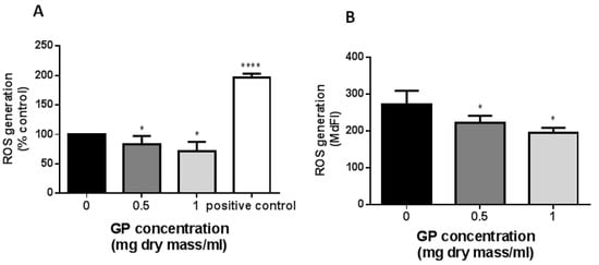 The GP extract reduced dose-dependently ROS generation by endothelial cells. In cells treated with the GP extract at 1.0 mg/mL, the level of intracellular ROS was decreased by approximately 30%. The effect of the GP extract was clearly seen in cells labeled independently with two different dyes H2DCFDA and DHR using an in vitro culture (Figure 5A,B). Doing experiments with DCFDA labeling in vitro, we use as the positive control H2O2. The ROS production in response to hydrogen peroxide was 196% ± 7% when compared with control cells. The reaction to H2O2 is usually between 80% to 150% higher than that observed in the control cell HUVEC line EA.hy926 (personal observation).