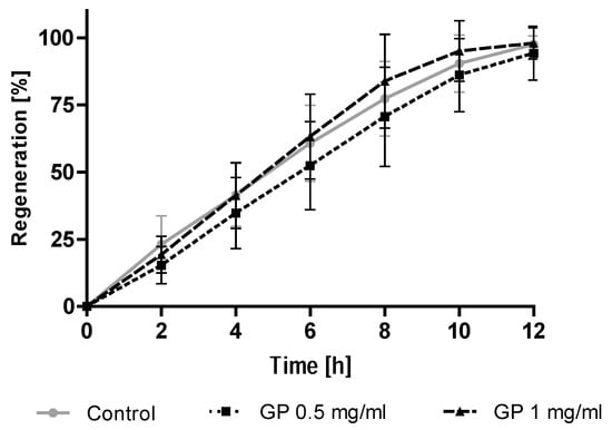 Exposure of the endothelial cells to the GP extract in concentration 0.5 mg/mL and 1 mg/mL, which caused complete healing of the damage after 12 h of the study (Figure 6). Regeneration kinetics did not differ significantly between the tested groups.