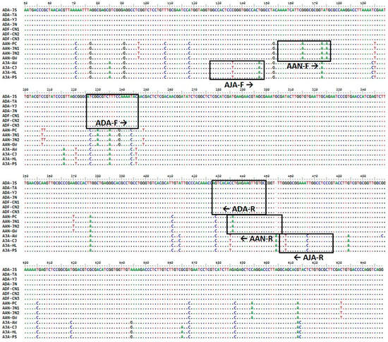 Approximately 700 bp of the ITS region was successfully amplified and sequenced from 15 plant samples (Table 1), and the sequence information was deposited in the GenBank database of the National Center for Biotechnology Information (NCBI; see Materials and Methods for accession numbers). The ITS sequences of A. dahurica and A. dahurica var. formosana were 100% identical. The length of the ITS region was 689 bp in A. dahurica and A. anomala and 690 bp in A. japonica (Table 2), and the sequences were aligned to a length of 690 bp. Intra-species variability was zero in A. dahurica, 0.0015% ± 0.0012% in A. anomala, and 0.0017% ± 0.0012% in A. japonica (Table 2). Inter-species variability ranged from 0.0423% ± 0.0021% to 0.0476% ± 0.0053% (Table 2). A species-specific insertion/deletion (indel) mutation was detected at one site in A. japonica, and species-specific nucleotide substitutions were detected at 18 sites in A. dahurica, 10 sites in A. anomala, and 16 sites in A. japonica (Table 2). These species-specific nucleotide polymorphisms were used to develop SCAR markers to discriminate among the three Angelica species (Figure 1).