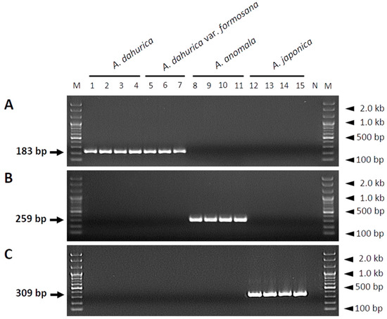Gel images showing the amplification of SCAR markers developed from sequence variations in the ITS regions of three Angelica species using species-specific primer pairs. The ITS sequences of A. dahurica (A), A. anomala (B), and A. japonica (C) were amplified using ADA-F/ADA-R, AAN-F/AAN-R, and AJA-F/AJA-R primer pairs, respectively. Primer sequences are listed in Table 3. Lanes 1, 2, 3, and 4 correspond to samples ADA-JS, ADA-TA, ADA-YJ, and ADA-NJ, respectively, of A. dahurica; lanes 5, 6, and 7 correspond to samples ADF-CN1, ADF-CN2, and ADF-CN3, respectively, of A. dahurica var. formosana; lanes 8, 9, 10, and 11 correspond to samples AAN-PC, AAN-JN1, AAN-JN2, and AAN-GW, respectively, of A. anomala; and lanes 12, 13, 14, and 15 correspond to samples AJA-AW, AJA-CJ, AJA-HL, and AJA-PS, respectively, of A. japonica. Details of all of these 15 samples are listed in Table 1. Lanes M and N represent the 100 bp DNA ladder and no template control, respectively. Arrows indicate the sizes of the PCR products, and arrowheads indicate the sizes of different molecular weight bands of the DNA ladder.