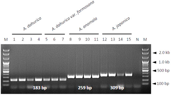 Gel image showing the multiplex SCAR assay developed in this study. PCR products were produced using three primer pairs (ADA-F/ADA-R, AAN-F/AAN-R, and AJA-F/AJA-R) in a single PCR reaction. Lanes 1–15 correspond to samples of Angelica species, as described in Figure 2. Lanes M and N represent the 100 bp DNA ladder and no template control, respectively. Sizes of PCR products are indicated on the image in white. Arrowheads indicate the sizes of different molecular weight bands of the DNA ladder.
