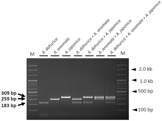 Gel image showing the effectiveness of the multiplex SCAR assay on DNAs of individual Angelica species (controls) and mixed template DNAs prepared by mixing the templates of two or more species. PCR products were produced using three primer pairs (ADA-F/ADA-R, AAN-F/AAN-R, and AJA-F/AJA-R) in a single PCR reaction. The template DNA used in each lane is indicated. Lane M represents a 100 bp DNA ladder. Arrows indicate the sizes of PCR products, and arrowheads indicate the sizes of different molecular weight bands of the DNA ladder.