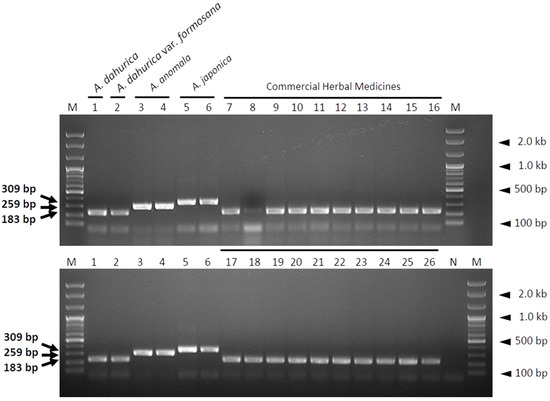 Identification of commercial Angelicae Dahuricae Radix samples using a multiplex SCAR assay. PCR products were produced using three primer pairs (ADA-F/ADA-R, AAN-F/AAN-R, and AJA-F/AJA-R) in a single PCR reaction. Lanes 1–6: Control plant samples; lanes 7–26: Commercial Angelicae Dahuricae Radix samples purchased from China and Korea (Table S1). Lanes M and N represent the 100 bp DNA ladder and no template control, respectively. Arrows indicate the sizes of PCR products, and arrowheads indicate the sizes of different molecular weight bands of the DNA ladder.