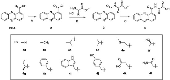 - Niu, J.; Chen, J.; Xu, Z.; Zhu, X.; Wu, Q.; Li, J. Synthesis and bioactivities of amino acid ester conjugates of phenazine-1-carboxylic acid. Bioorg. Med. Chem. Lett. 2016, 26, 5384–5386. [Google Scholar] [CrossRef] [PubMed]