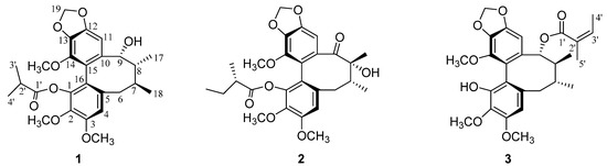 - Liu, J.S.; Li, L. Kadsulignans L–N, three dibenzocyclooctadiene lignans from Kadsura coccinea. Phytochemistry 1995, 38, 241–245. [Google Scholar] [CrossRef]