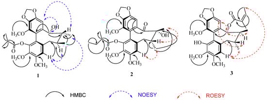 Key HMBC and NOESY correlations of heilaohulignan A (1) and ROESY correlations of heilaohulignans B–C (2–3).